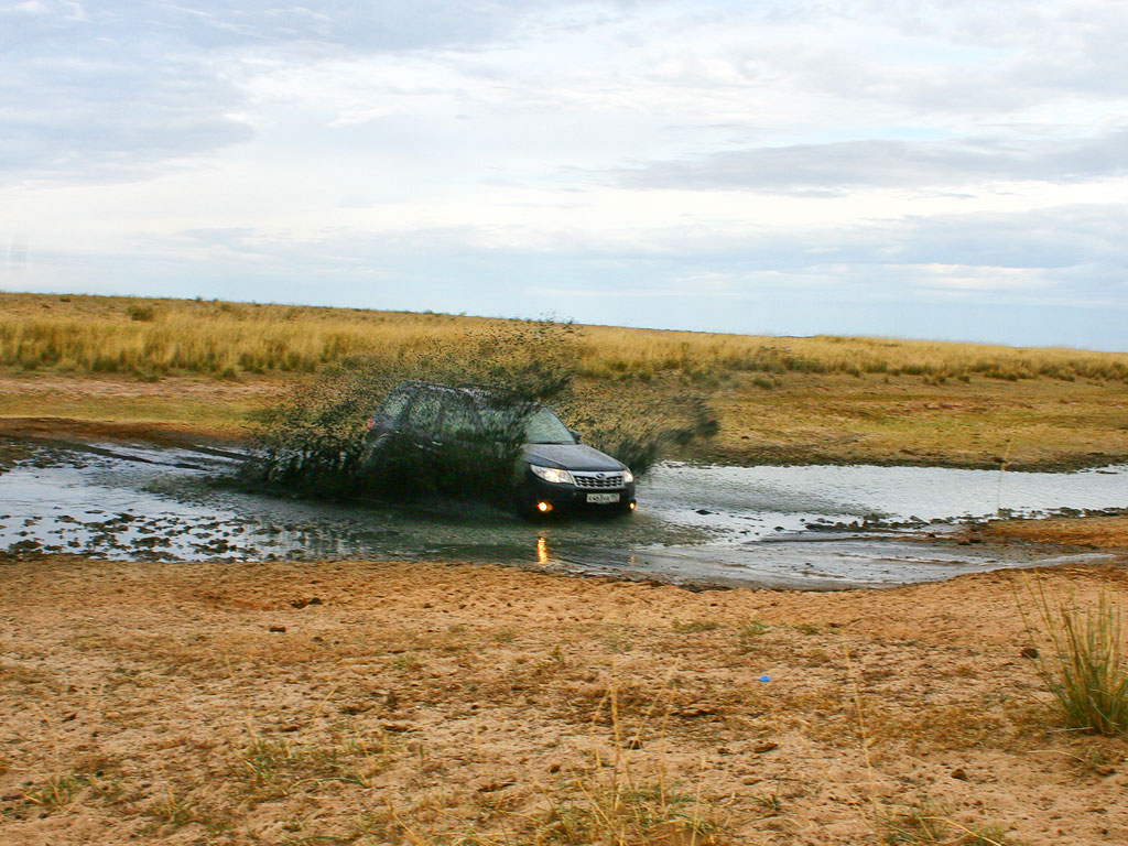 Пора домой. Снова сажусь в «лесника». Впереди опять более 200 км степных направлений и столько же разбитого асфальта республиканской дороги. Степь погружалась во тьму. Острый луч ксеноновых фар разрезал темноту, выхватывая из неё куски полупустыни. Уже в спокойном темпе, без спешки, более достойной прохождения очередного спецучастка иного ралли, наши «форики» пересекали то ли степь, то ли полупустыню. При езде по укатанным степным дорогам на небольшой скорости, т.е. примерно 40-60 км/ч, Forester едет и вовсе как высококлассный лимузин. Не трясёт, не кидает из стороны в сторону. И двигатель практически не слышно в салоне.