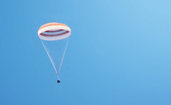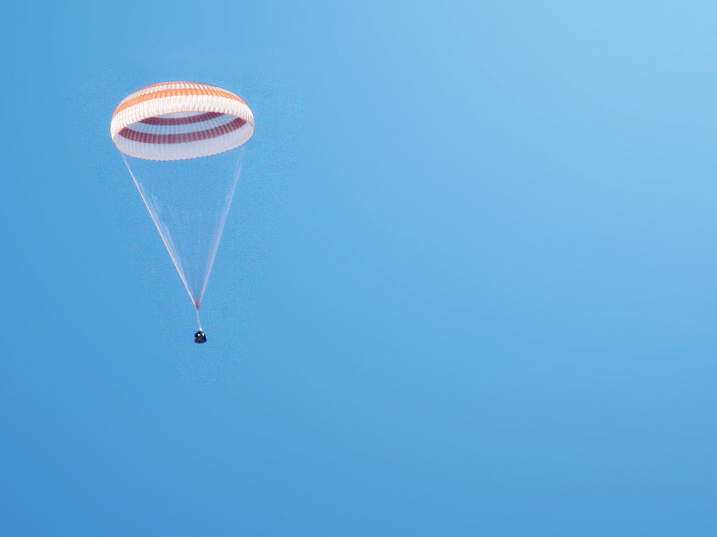 9:48. В небе появился купол парашюта, на котором спускается СА.
