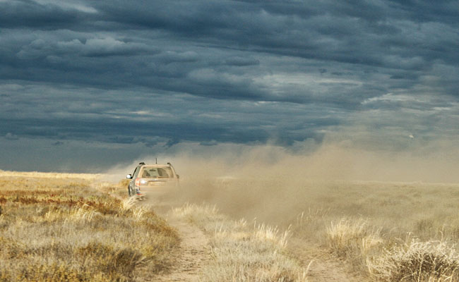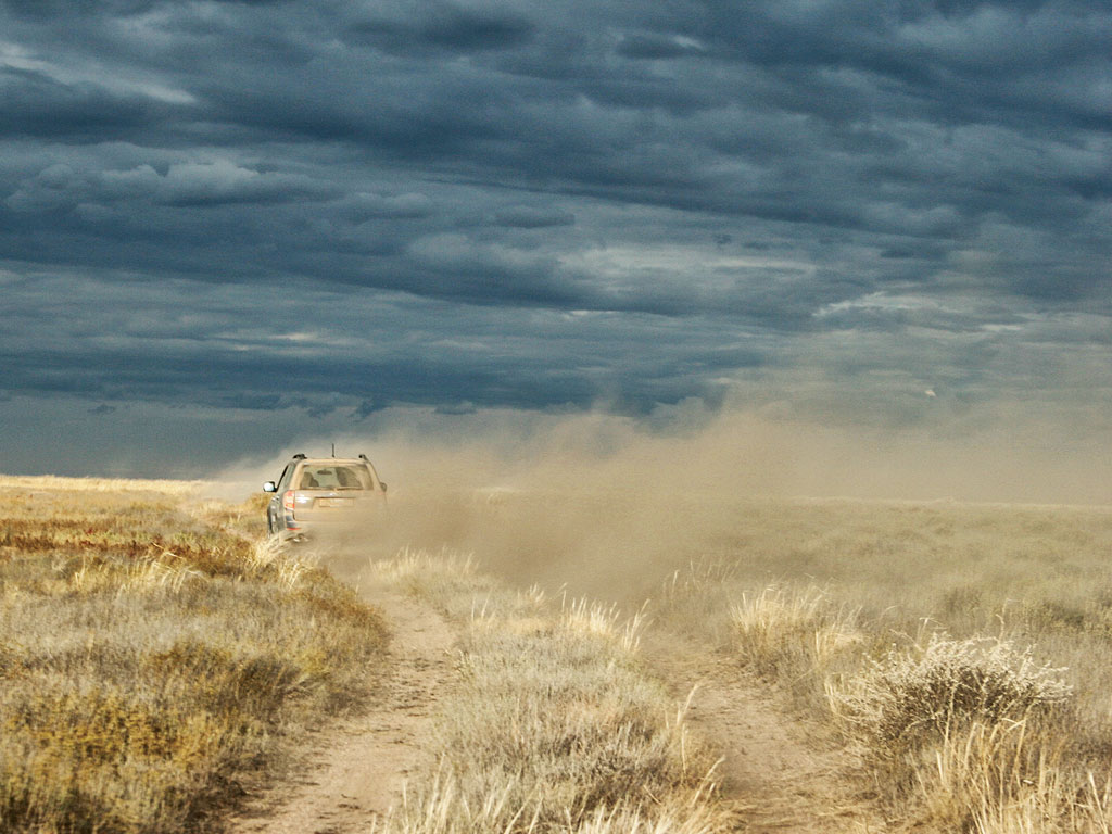 Примерно в 11 часов меня посадили в турбированный Subaru Forester в комплектации S-Edition и повезли на запад. Впереди ожидает полтысячи километров, половина из которых приходится на разбитый асфальт республиканской дороги А-17, соединяющей города Павлодар и Кызылорда, а половина — бескрайние просторы наших степей. Просто степь, где придётся ехать как по укатанным грунтовкам, так и просто по азимуту.