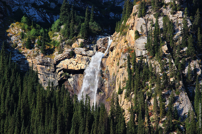 Первую остановку стоит сделать через 23 км после поворота. Там находятся два популярных водопада Чаша Манаса и Слёзы барса.