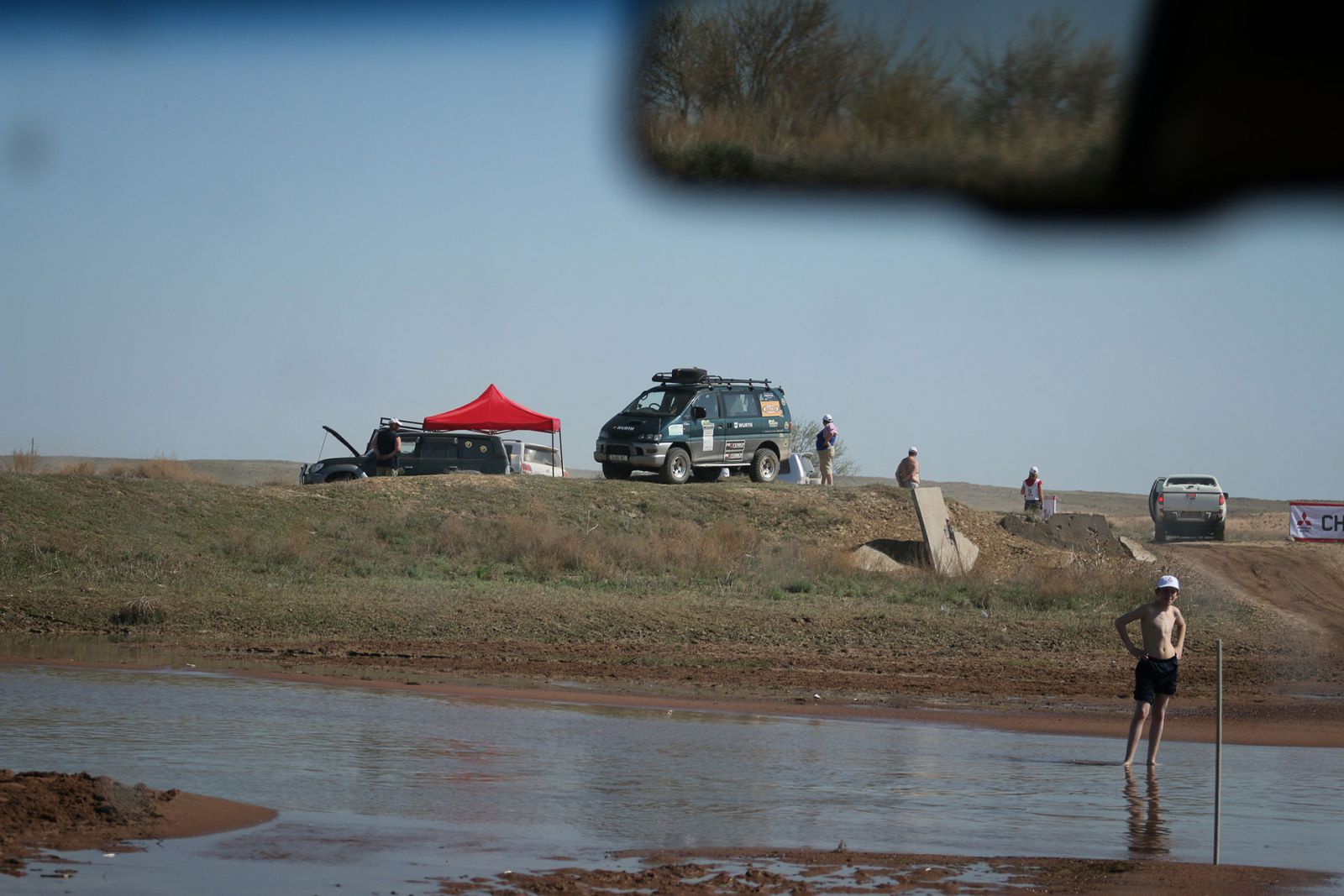 Только мы выехали на трассу и двинулись дальше, как неожиданно наткнулись на искомый красный шатёр. Как выяснилось, ещё час назад цель была очень близка — до чекпоинта не доехали какой-то километр. Жуткая досада! Дальше мы ехали с полным осознанием того, что слили гонку, а этот факт напрочь убил азарт. Оставалось просто двигаться к финишу, а когда «дорожка» вновь переставала «бить», то просто ехали по наиболее накатанной дороге — это оказалось самой правильной тактикой в данном случае.