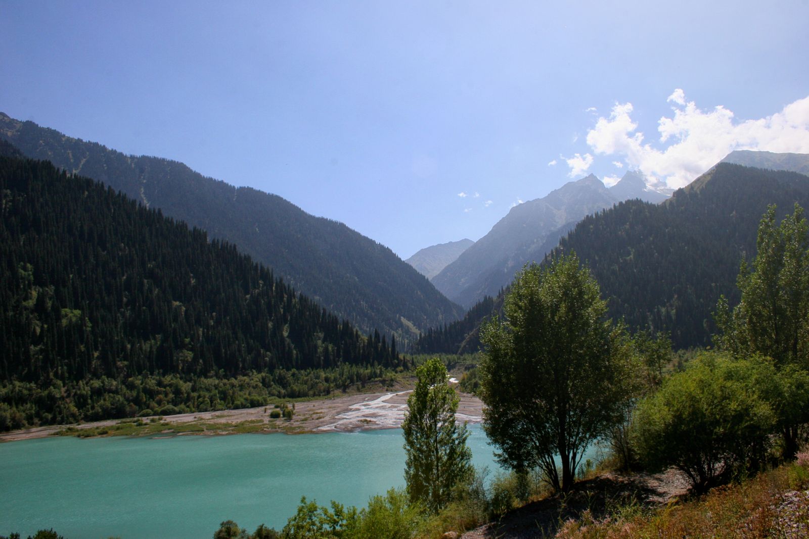 Озеро, река, густой хвойный лес на склонах гор. А на бывшем дне того, ещё не разрушенного селем, озера находится берёзовая роща.
