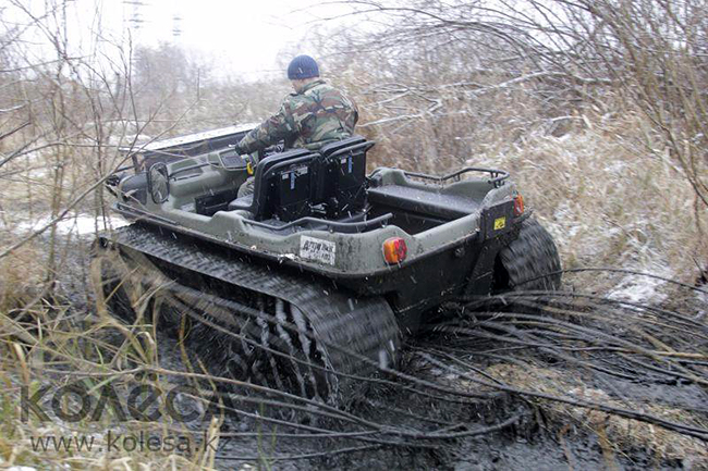 Такие вездеходы продают в Казахстане в нескольких вариантах: 6×6 и 8×8. Здесь важно, что, сколько бы у него колёс ни было, все ведущие. В основе аппарата трубчатая рама и пластиковая «лодка», внутри которых смонтированы все узлы и агрегаты, включая V-образный 748-кубовый двигатель Kohler мощностью 31 л. с. Вездеход интересен тем, что легко превращается из колёсного в гусеничный и наоборот. Специальные гусеницы надеваются на каждый ряд колёс.