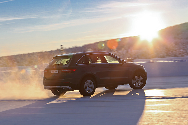 В свободную минутку мы решили немного поэкспериментировать. Установили на GLC опциональные шипованные 20-дюймовые Nokian Hakkapeliitta 8 SUV и выехали на лёд. И что вы думаете? На R20 «шипы» автомобиль заметно хуже и медленнее управляется, чем на R17 «липучка». Реакция на поворот руля неоднозначна. Это доказало и время круга — R20 приезжают позже на несколько секунд. Больше в данном случае не оказалось лучше. Всё дело в пропорциях — соотношении ширины шины к её профилю. У нас этот показатель равнялся 255/45 для «двадцатых» колёс. Если у шины очень широкая поверхность протектора, то давление неравномерно распределяется в пятне контакта, что приводит к ухудшению управляемости, выполнения манёвра, мешает разгону. Особенно на зимних покрытиях. Это также приводит и к ухудшению тягово-сцепных свойств, потере стабильности и управляемости шины. И шипы, как ни странно, не сыграли на время круга на льду. Отчасти именно по этой причине оптимальным типоразмером для среднеразмерного кроссовера и является тестовый 235/65R17. На заметку владельцам при выборе зимнего размера колёс: зимой мы бы посоветовали сделать выбор в пользу шин с минимальной шириной протектора, из размеров, рекомендованных производителями разумеется. Меньший размер колёс — это больше управляемости, комфорта, экономичности и меньше затрат. Страдает в данном случае исключительно общий look автомобиля.