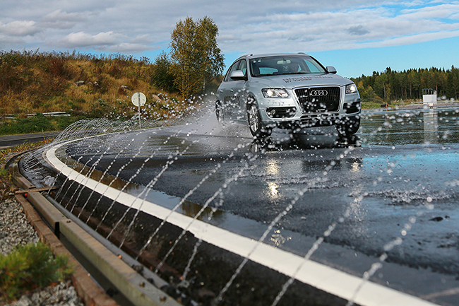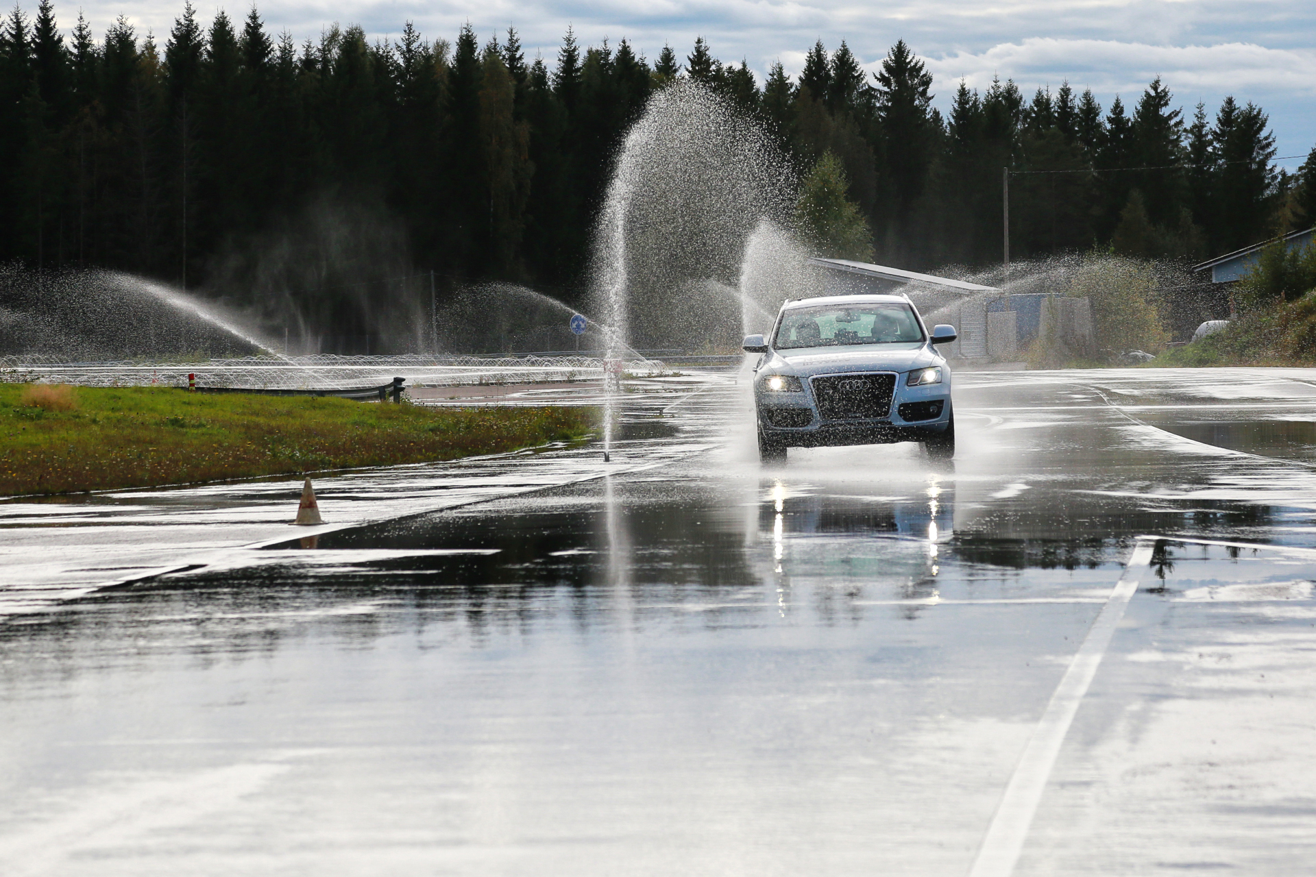 Залитая водой трасса управляемости позволяет понять, что разница в поведении шин гораздо больше, чем казалось после заездов по сухому асфальту. Так, ехать заметно быстрее позволяют шины Hankook, что можно объяснить в первую очередь их высокой жёсткостью. Наиболее медленными оказались шины Toyo, однако назвать их аутсайдерами язык не поворачивается — очень понятные и предсказуемые покрышки. Стоит только приблизиться к пределу сцепных свойств, как шины начинают визжать, предостерегая водителя. Это не позволяет разгоняться до тех скоростей, когда возможна потеря управляемости. Относительно быстро можно ехать на покрышках Continental, но даётся это непросто. На этом комплекте автомобиль обретает избыточную поворачиваемость, но обратная сторона медали — резкие срывы в занос, которые приходится корректировать быстрыми движениями руля. Остальные образцы показали похожие результаты, а разница в поведении определялась лишь деталями. На шинах Bridgestone автомобиль не так охотно заезжает в поворот, Nokian наделяют машину недостаточной поворачиваемостью, а на MICHELIN сразу же получилось ехать. Небыстро, но стабильно и ровно.