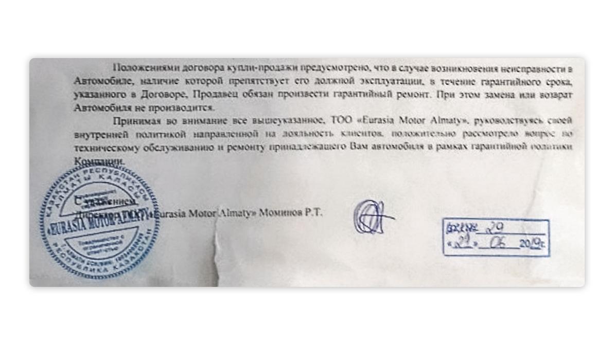 Рассказывать о ситуации только со стороны потребителя было бы неправильно, поэтому редакция Kolesa.kz обратилась за комментарием к официальному дилеру. В его интерпретации история выглядит несколько иначе. В подробности представители Eurasia Motor Almaty вдаваться не стали, но сообщили,