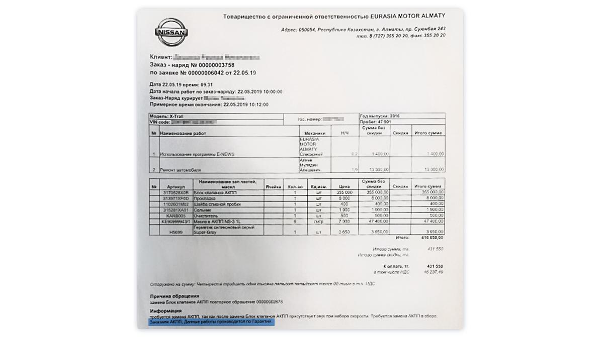 Судя по информации из заказа-наряда, мастера в Eurasia Motor Almaty попробовали отремонтировать коробку, заменив ту саму гидроплиту, в которую интегрирован соленоид. Желаемого результата процедура не дала. В документе от 22 мая 2019 года говорится о необходимости замены CVT, так как после ремонта присутствует «звук при наборе скорости». Стоимость работ покрывает гарантия. Также отмечается, что новый вариатор уже заказан (есть основания полагать, что на самом деле деталь заказали только спустя несколько месяцев, в конце июля 2019 года).