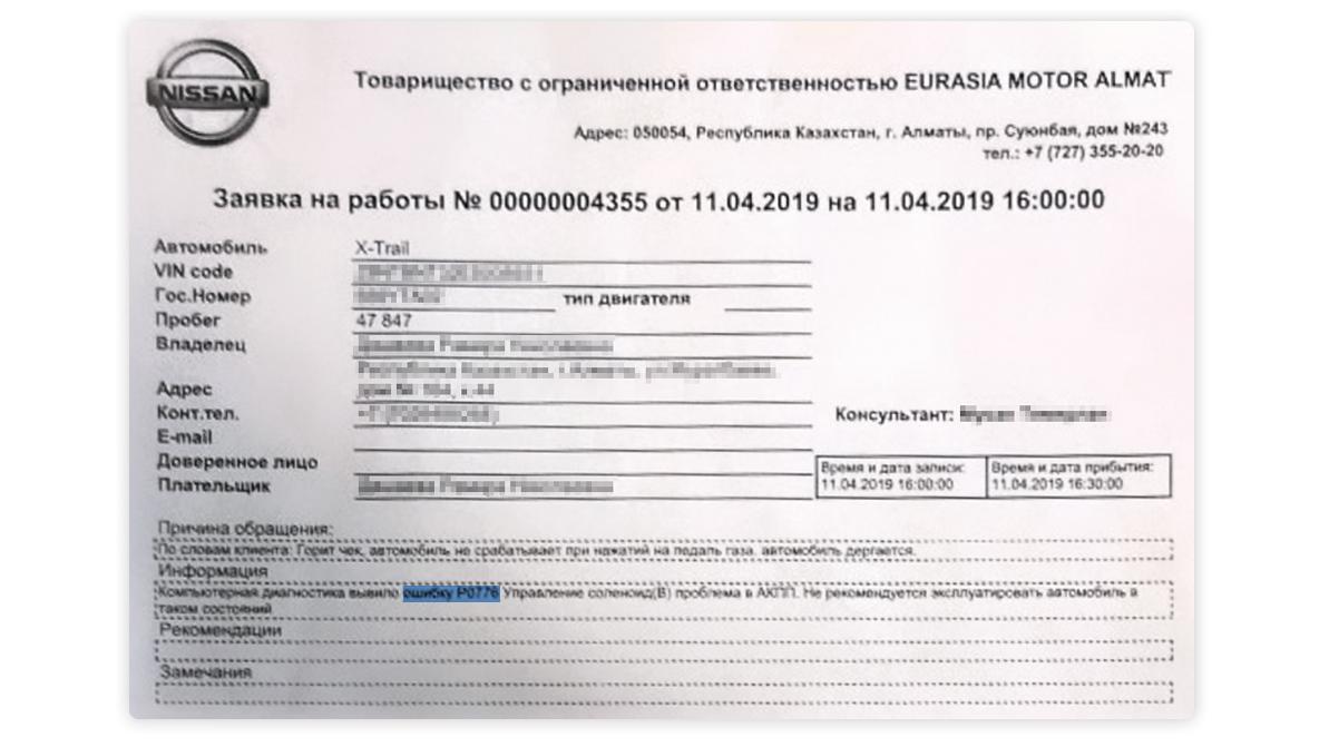 Машину отправили на сервис дилера Nissan (Eurasia Motor Almaty), где диагностика показала проблемы с электромагнитным клапаном управления давлением рабочей жидкости (ошибка P0776). В частности, имеется в виду, что соленоид мог залипнуть в закрытом состоянии.