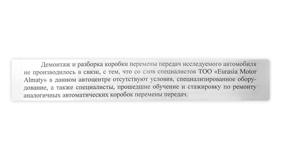 Выводы о состоянии вариатора и причинах появления неисправности эксперты делали по результатам визуального осмотра детали, проверки уровня и состояния масла, следам снятия поддона, а также покатушкам по парковке сервисного центра Eurasia Motor Almaty и компьютерной диагностике. Последняя, кстати, показала любопытный результат. Вместо кода P0776 появился P17F0, что эксперты проигнорировали. Разобрать CVT им не дали. На СТО сослались на то, что специалистов, способных это сделать, нет.