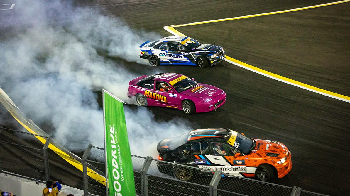 Кульминация выступления десанта RDS GP — проезды втроём. Первым и наиболее зрелищным стал выезд Nissan 370Z, Toyota Supra и Nissan Silvia под управлением Аркадия Цареградцева, Никиты Шикова и… Романа Тиводара. Да, на культовой S15 в «тройничке» ехал не сам Гоча, а его сокомандник. Тем не менее проезды получились, как у дрифтеров говорится, «мясными».