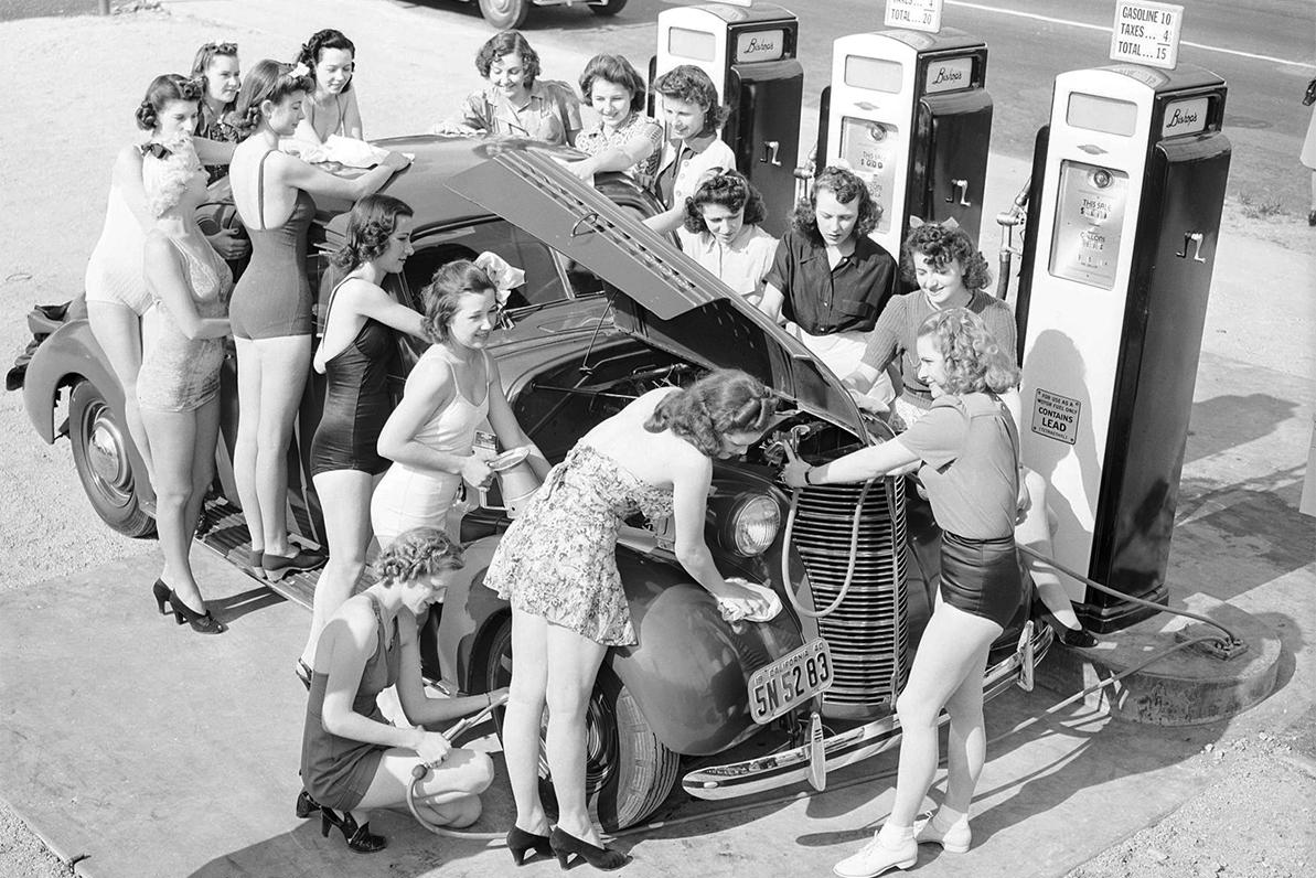Кстати, уже тогда автовладельцы догадались, что симпатичные мойщицы — это не только привлекательно эстетически, но ещё и некая волнующая возможность продолжения банкета, если рядом нет жены. Только зачем вас так много? Эй-эй, дамы, не наваливайтесь так, автомобиль не танк, всех не выдержит!