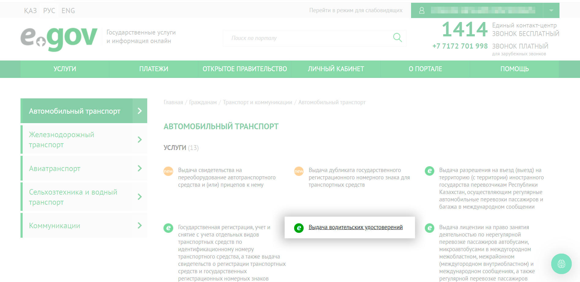 1. На портале egov.kz необходимо авторизоваться с помощью ЭЦП (у кого нет, можно получить удалённо, не выходя из дома), зайти в раздел «Транспорт и коммуникации», далее в подраздел «Выдача водительских удостоверений».