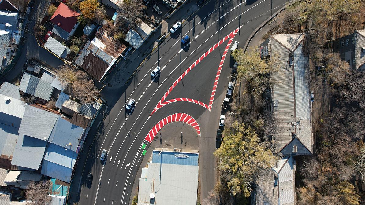 А главное новшество улицы — двусторонняя велополоса, которая начинается от ул. Манаса и тянется до Шаляпина, по всей северной стороне Сатпаева. Непродуманность её заключается в обрыве на пересечении ул. Щепеткова, Шаляпина и Утеген батыра: велополоса упирается в