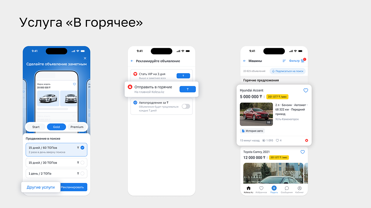 В ГОРЯЧЕЕ — при подключении услуги «В ГОРЯЧЕЕ» объявление публикуется в выделенном блоке — вверху раздела «Машины» на сайте и в приложении. Объявление выделяется ярким огненным знаком. Работает 24 часа с момента подключения.