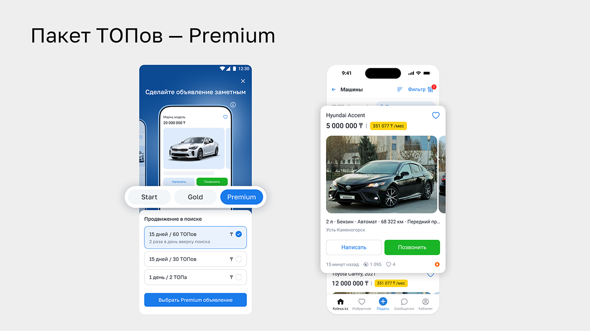 - Premium — самый большой размер объявления с листанием фото и кнопками «Позвонить» и «Написать» в ленте рекомендаций в разделе «Машины».