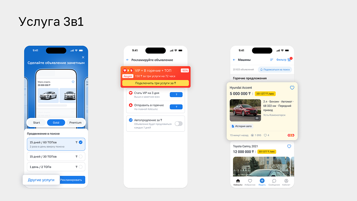 «З в 1» — специальное предложение для тех, кто раньше не пробовал платные опции на Kolesa.kz. Это способ протестировать продвижение и понять, как использовать инструменты, чтобы продать авто быстрее.