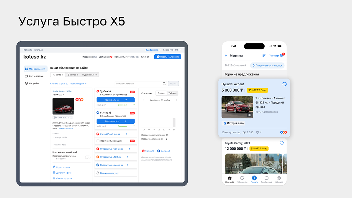 «Быстро Х5» — пакет для длительного размещения объявления с усиленным продвижением в первые дни. Подключить услугу можно только с сайта Kolesa.kz.