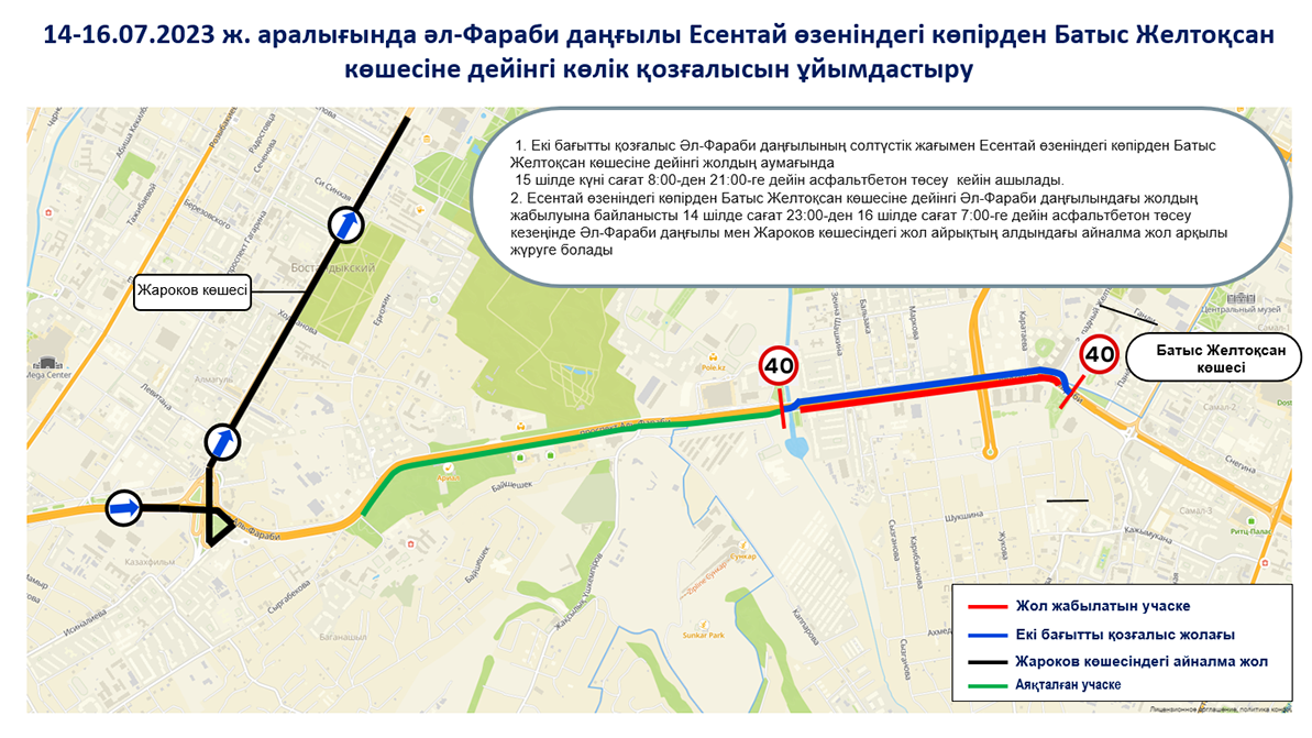 Полицейлер жол көлік апатын алдын алу мақсатында 14 шілде 23:00 мен 16 шілде 7:00 аралығында шығыс бағытта (Есентай арқылы өтетін көпірден бастап) көлік қозғалысын толық шектейді.