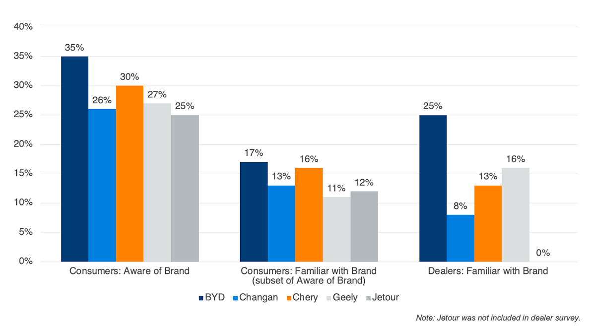 Америкадағы автосүйер қауымның басым бөлігі брендтердің атауын білмейді. Небәрі 17 %-ы хабардар. Олар көбіне BYD, Changan, Chery, Geely және Jetour сияқты өндірушілерді атаған.
