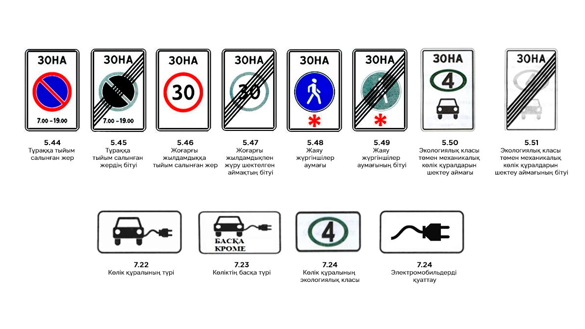 5.50, 5.51 мен 7.24 Алматыны дамыту жобасында айтылған мәселелер. Осы тақтайшалардың көмегімен экологиялық класы сәйкес емес көліктерге қаланың кей аудандарына кіруге тыйым салынады.