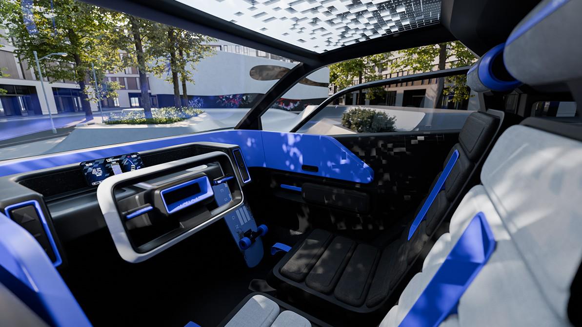 Үлкен рөл мен шағын аспаптар панелі тұрған салоны футуристік стильде жасалған. Педаль мүлдем жоқ, ол тек қолмен басқарылады. Мүмкіндігі шектеулі жандар ештеңе өзгертпей пайдалана алады. Интерфейсті смартфонға жіксіз қосып, кейбір функцияны қашықтан басқару қарастырылған.