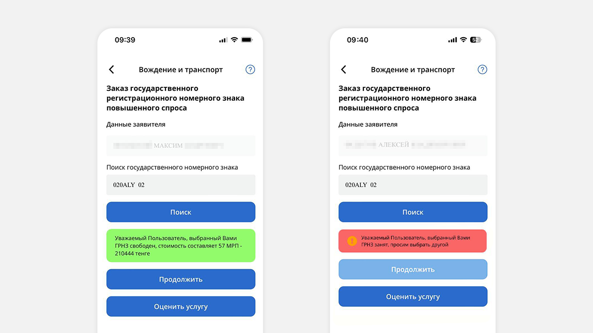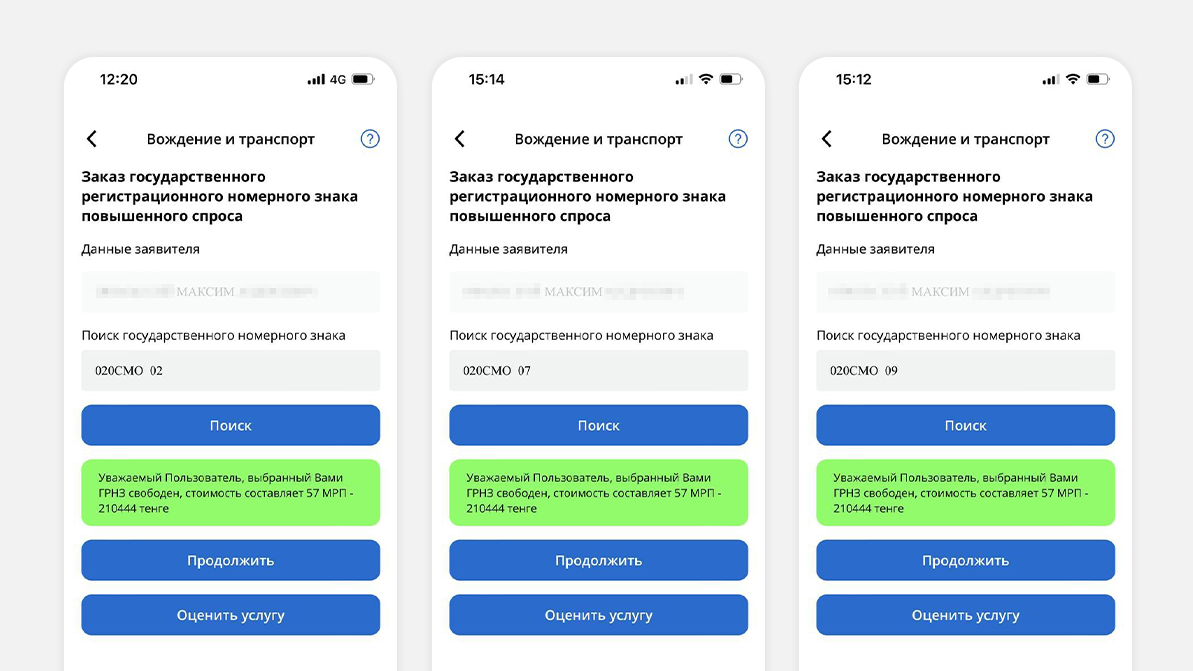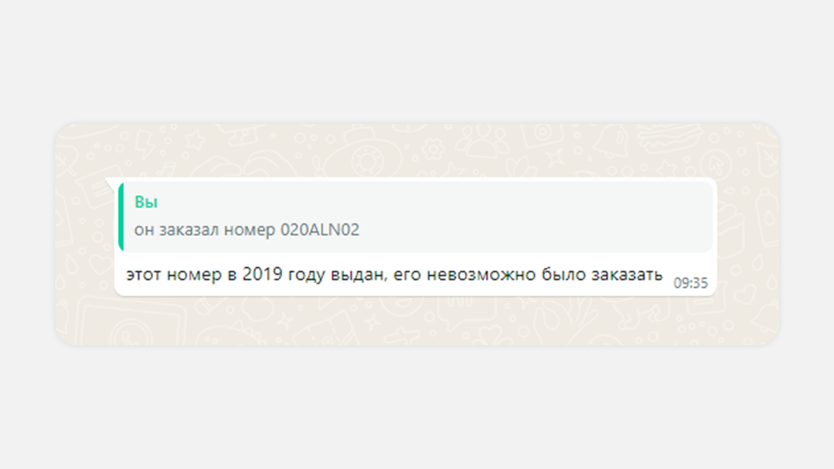 Мәселе тіпті ушығып кетті. Дүйсенбі күні, 27 мамырда, Ақпараттық-өндірістік орталық редакцияға eGov Mobile 020 ALN 02 нөмірін таңдауға мүлдем рұқсат бермеуі керек еді, өйткені ол 2019 жылдан бері басқа біреудің атына тіркелген деп жауап берді. Яғни, Максим бос емес комбинацияны сатып алған. Максим тағы бір рет тексергенде 020 ALN 02 бос болды.