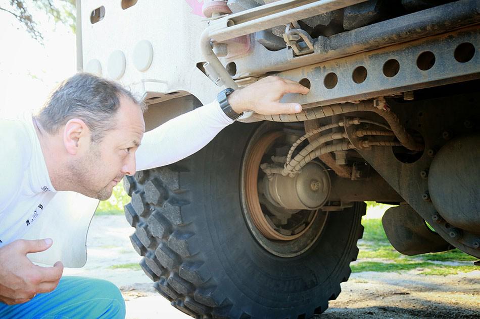 Этап 12. Сан-Хуан — Вилья-Карлос-Пас. 481 км. 15.01.2016. Артур Ардавичус осматривает боевой автомобиль после этапа