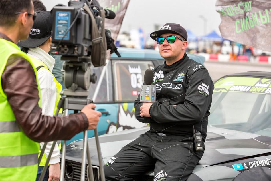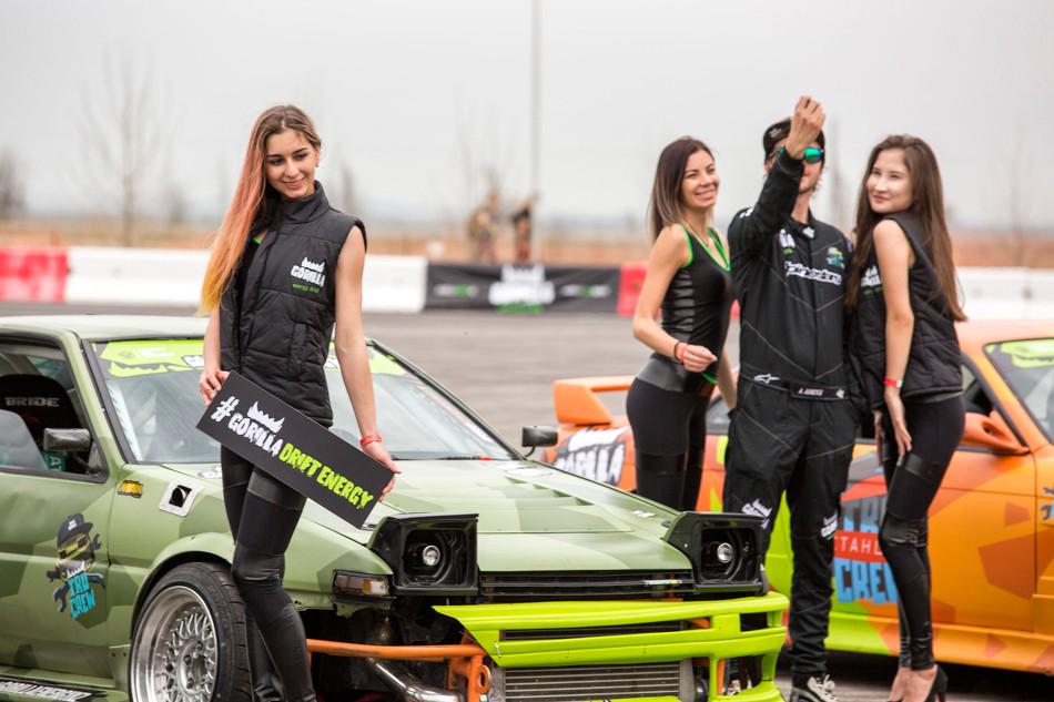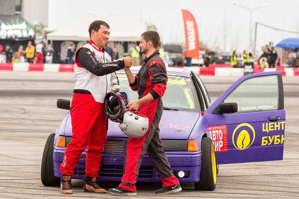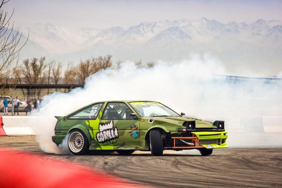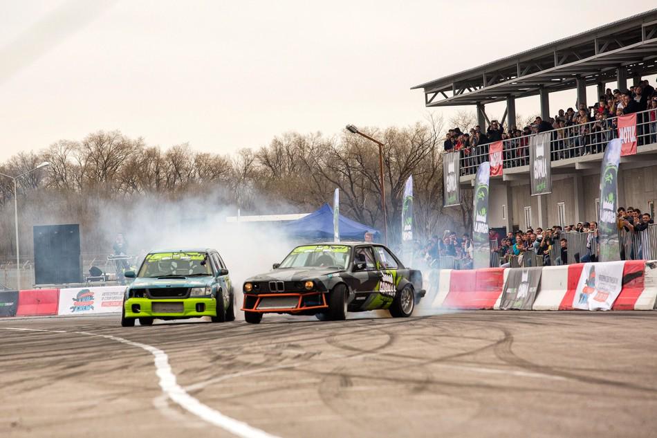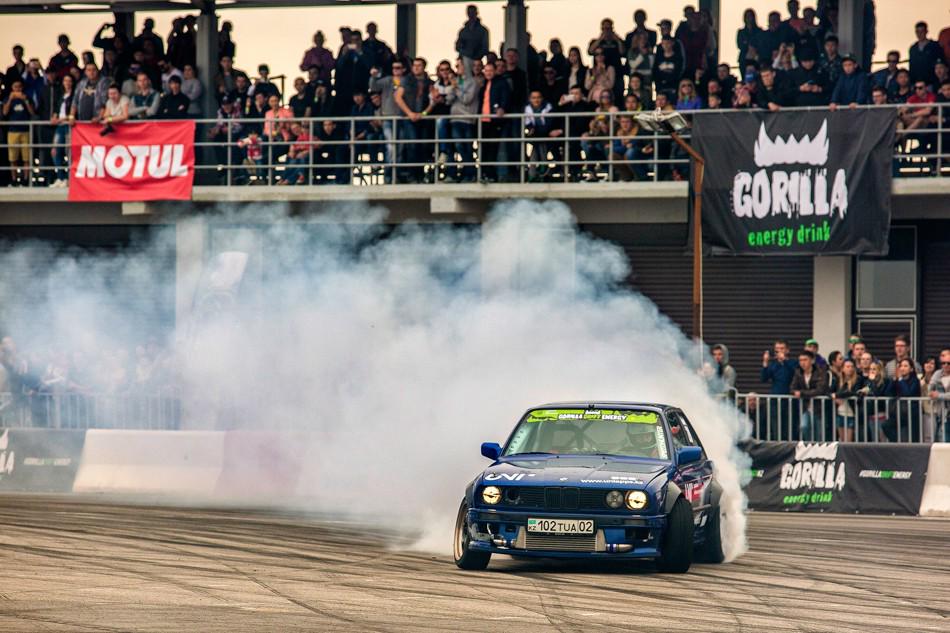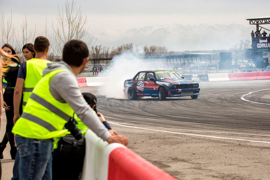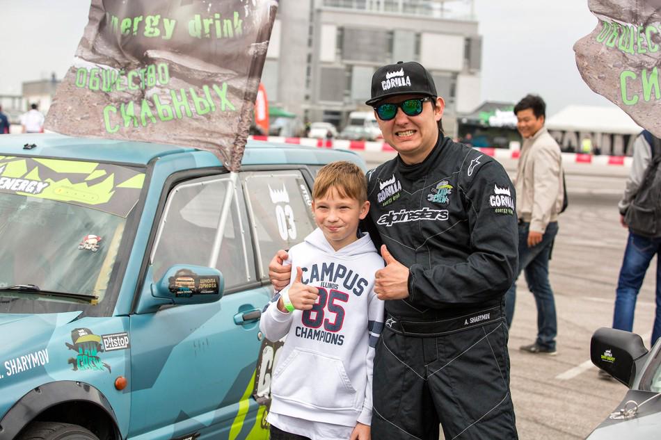 В небольшом перерыве между топ-8 и топ-4 зрителям предложили за определённую сумму прокатиться в дрифт-каре. На фото как раз один из проездов. Если нам не изменяет память, то раньше казахстанские дрифтеры таким паровозиком с пассажирами не ездили