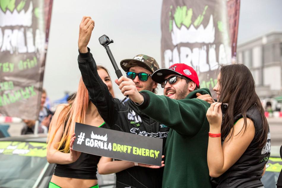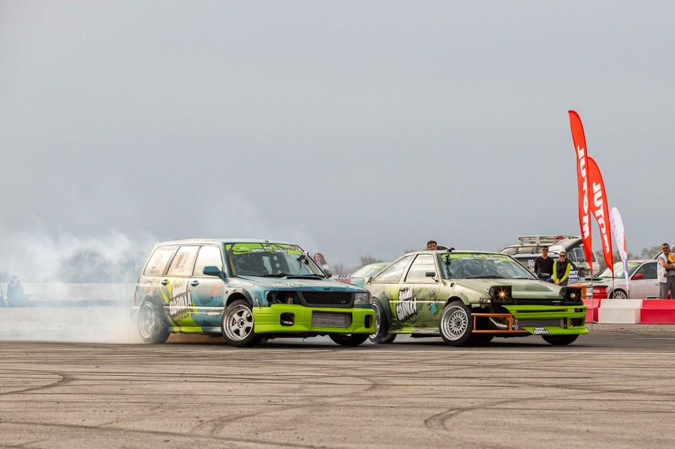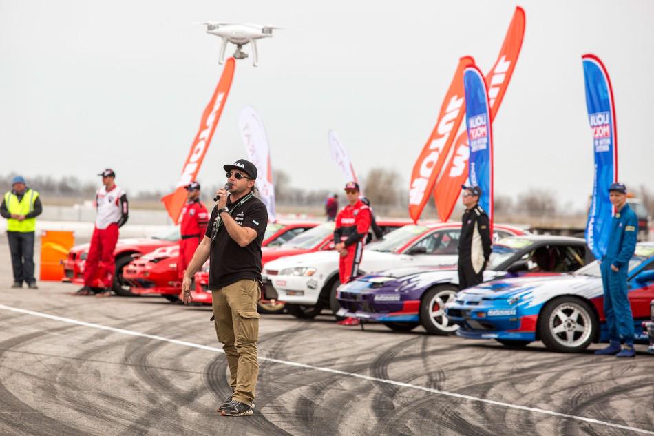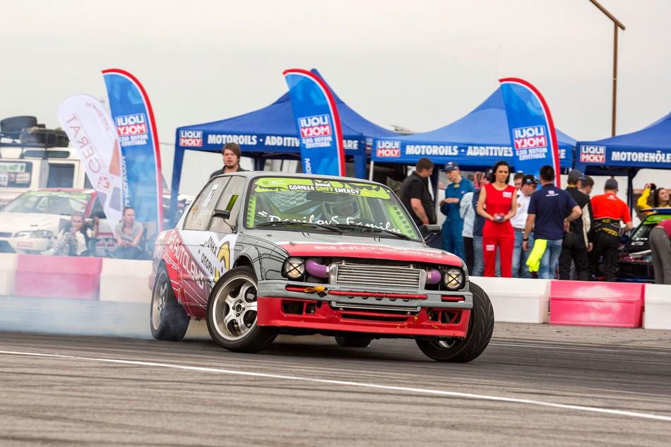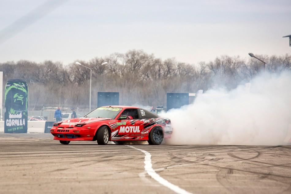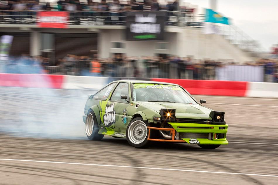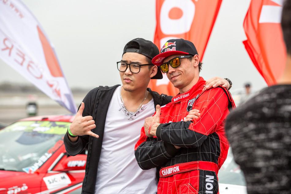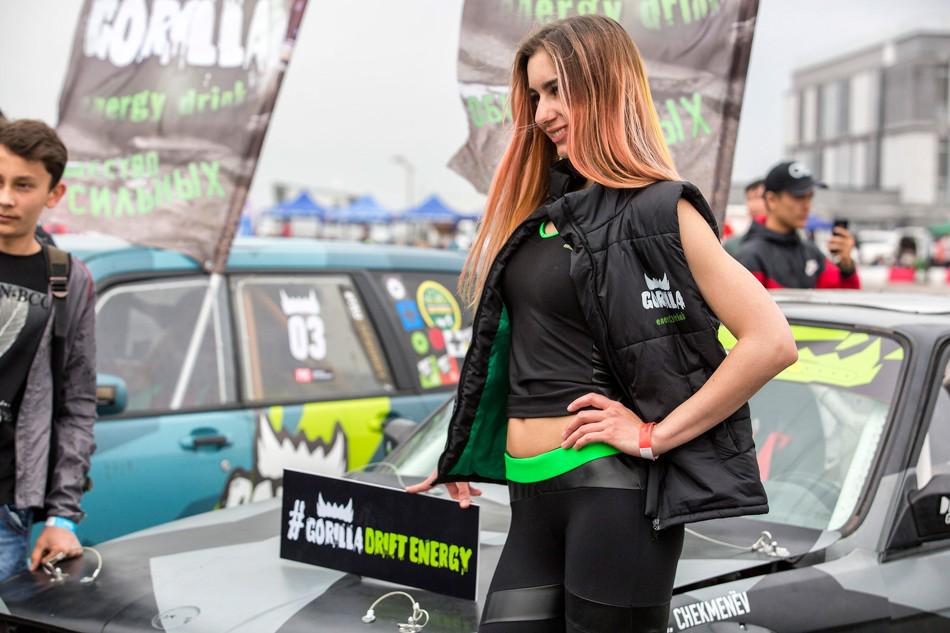 В небольшом перерыве между топ-8 и топ-4 зрителям предложили за определённую сумму прокатиться в дрифт-каре. На фото как раз один из проездов. Если нам не изменяет память, то раньше казахстанские дрифтеры таким паровозиком с пассажирами не ездили