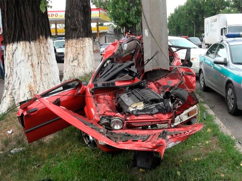 Водитель красной «тройки» в кузове Е30 ехал по проспекту Суюнбая в южном направлении. Заметно превысив скоростной режим и не справившись с управлением, он в итоге врезался в мачту городского освещения. В результате ДТП передняя часть авто была разорвана пополам. Основной удар пришёлся на место водителя.