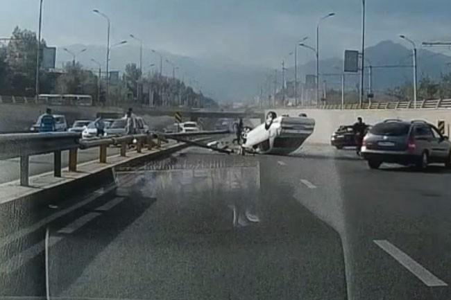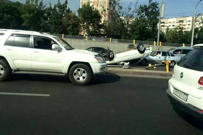ДТП произошло сегодня утром, в начале девятого, на Саина, чуть ниже моста на пересечении с проспектом Абая. Как видно из кадров, запечатлённых видеорегистратором одного из водителей, белая Toyota Camry 20 ехала по Саина в северном направлении. По невыясненным пока причинам машина столкнулась с Daewoo Nexia серого цвета, перевернулась и вылетела через разделительное ограждение на встречную полосу, задев при этом двигавшуюся по ней чёрную Toyota Camry 50.