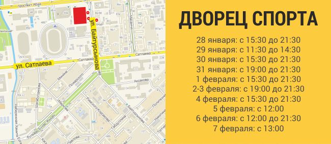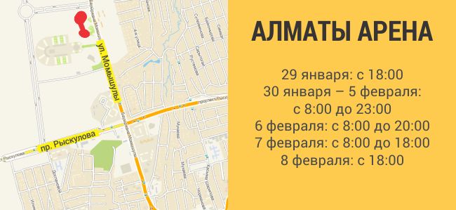Также в хоккей будут играть и во Дворце спорта им. Балуана Шолака на пересечении улицы Байтурсынова и проспекта Абая. Помимо хоккеистов там будут соревноваться и конькобежцы. Значительная часть мероприятий запланирована на вторую половину дня, и продолжатся они вплоть до 9 часов вечера. Однако есть и дни, когда атлеты приступят к состязаниям пораньше. Так, 29 января состоится женский хоккейный матч между сборными США и России. Начнётся он в 12:30, но пробки на подъездах наверняка соберутся раньше.