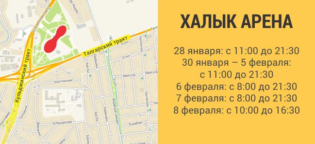 Хоккей с шайбой является весьма популярным видом спорта. Так что вокруг «Халык Арены» на Кульджинском тракте может скопиться множество машин. Игры там начнутся с 28 января и будут ежедневно проводиться вплоть до закрытия Универсиады 8 февраля. Единственным исключением станет 29-е число. В основном соревнования планируют начинать в 12:30, и лишь последнюю игру дня собираются проводить в 20:00. Однако зрители явно начнут прибывать пораньше. Так что если часиков в 11 вы можете оказаться рядом с «Халык Ареной», то, возможно, стоит поискать пути объезда.