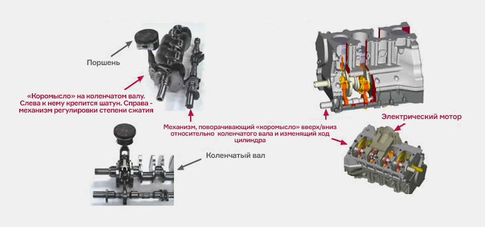 Это стало возможно благодаря новому устройству коленчатого вала. Разработчики надели на него своего рода коромысло. Слева к нему прикрепили шатун, а справа — рычаг, который управляется электромотором. Его движение меняет положение шатуна относительно коленвала, меняя тем самым степень сжатия. Предположительно такой мотор сможет одинаково хорошо работать во всём диапазоне оборотов, находясь на грани детонации, и с идеальным углом опережения зажигания. По словам инженеров, их разработка позволит 4-цилиндровому ряднику конкурировать в отдаче с V6, а в экономичности с лучшими дизелями.