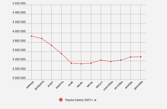Наиболее широко представленная на рынке б/у Toyota Camry («сороковка» 2007 г. в.) стоила в начале 2016 года около 4 млн тенге. Таких «Камри» только на сегодняшний день более 620 в продаже. К маю цены упали до 3.4 млн, а уже с июля вновь начали расти и к концу года вернулись к отметке 3.5 млн.
