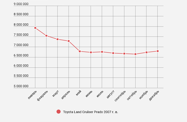 Из внедорожников в нашем списке выбор пал на 10-летний Toyota Land Cruiser Prado. Средняя стоимость таких внедорожников достигла дна в октябре минувшего года. Тогда «120-й» можно было купить за 6.6 млн тенге. Это на 16.2 % меньше цены в начале года, а вот к концу декабря она выросла почти на 200 тысяч тенге и составляет 6.8 млн.