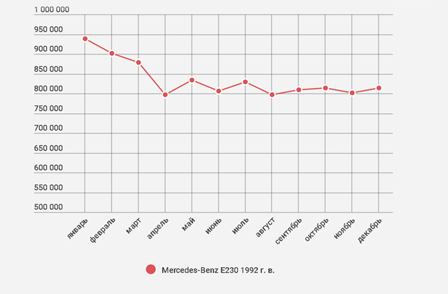 Начнём со старичка, а именно «ешки» в кузове W124. Больше всего в базе объявлений kolesa.kz Mercedes-Benz E230 1992 года выпуска. В декабре 2016-го средние цены на E-Class находились на отметке 814 тысяч тенге. В начале года этот показатель был на 28.6 % выше, то есть просили более 1 млн тенге. А самые доступные цены на «124-й» оказались в апреле и августе 2016-го — в среднем 796 тысяч тенге.