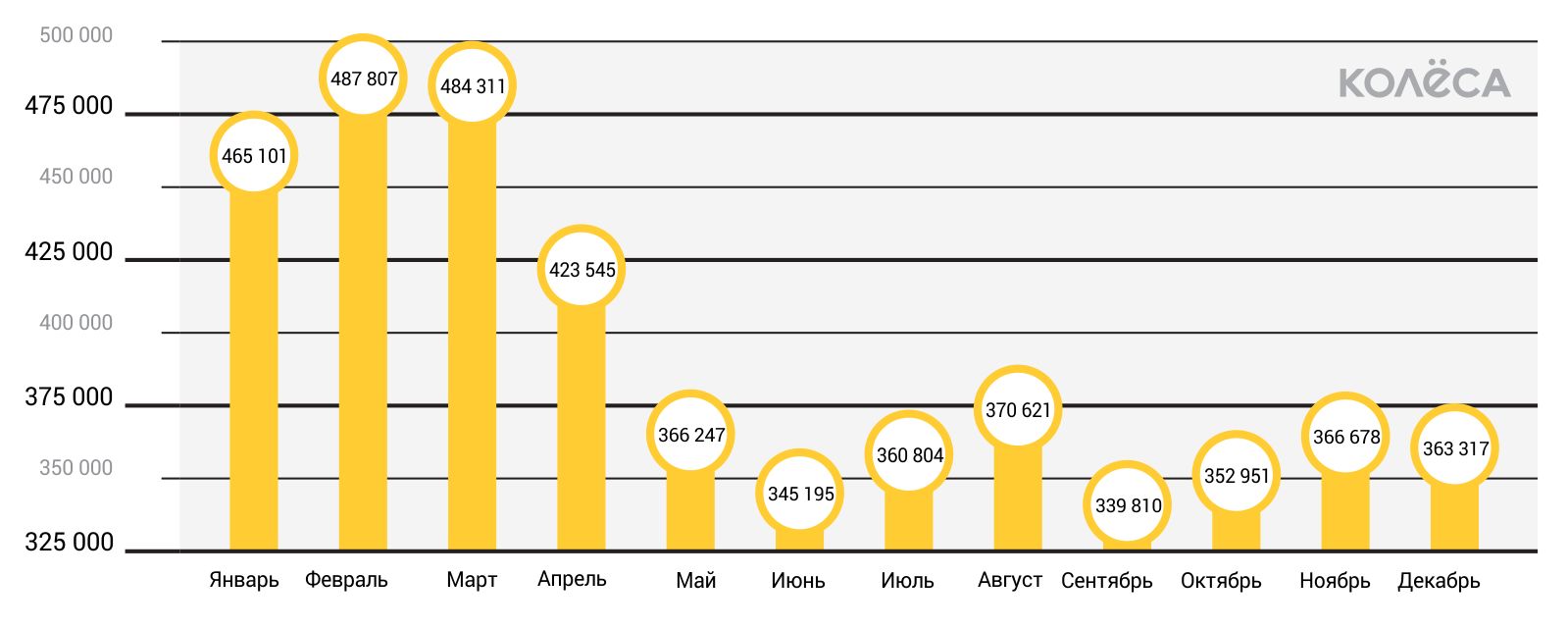 Если в начале года на сайте на продажу ежемесячно выставлялось почти полмиллиона автомобилей, то к концу года их количество сократилось до 350–360 тысяч. Пик активности продавцов пришёлся на февраль. В самый короткий месяц в году был и разгар ввоза авто из России, и за этот период на Kolesa.kz было подано 487 807 объявлений о продаже авто. Наибольший провал был зафиксирован в сентябре, когда на продажу было выставлено всего 339 810 автомобилей. Немного больше желающих продать автомобиль нашлось в следующем месяце — в октябре на продажу было выставлено 352 951 авто. Такое снижение по количеству предложений напрямую связано с обвалом национальной валюты, когда в сентябре курс доллара к тенге достиг отметки 270 и продолжал падать.