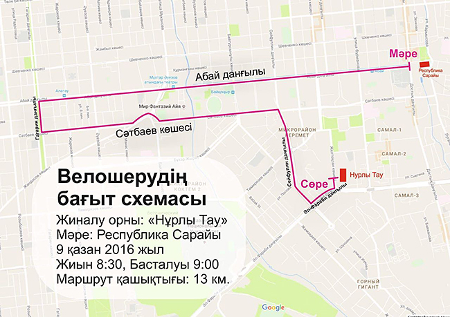 В воскресенье утром, 9 октября, в городе состоится велопробег. Стартовав от БЦ «Нурлы Тау» участники проедут по пр. Аль-фараби, пр. Сейфуллина, ул. Сатпаева, пр. Гагарина и по пр. Абая к финишу у Дворца Республики. Сбор участников в 8:30, а старт 13-километрового пробега в 9:00.