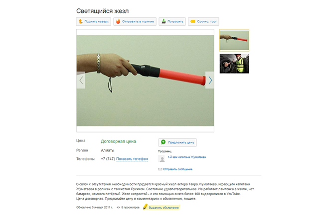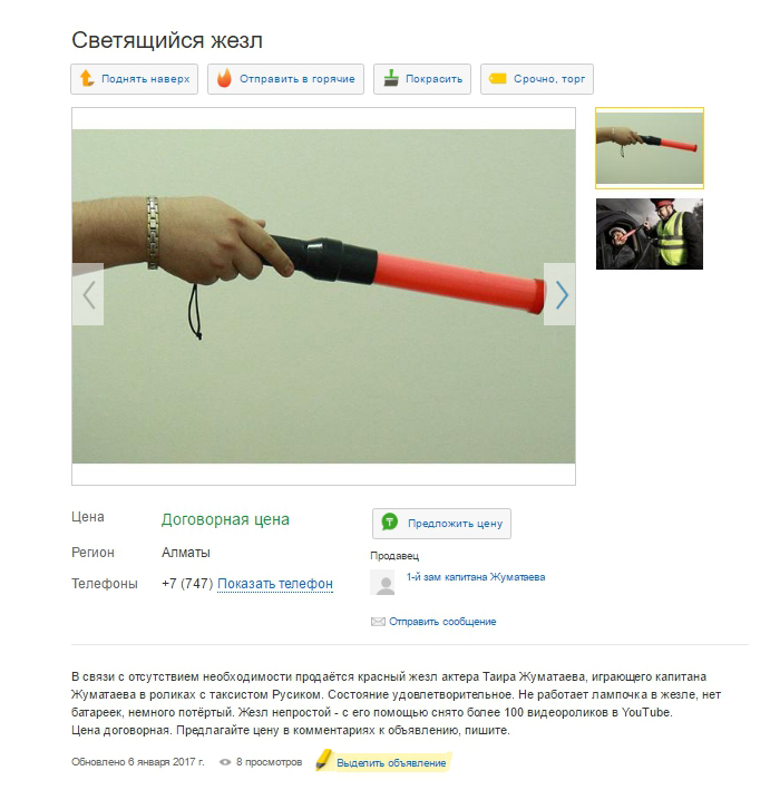 Объявление о продаже жезла, которым гаец-молодец любил постучать в окошко таксисту Русику, появилось на «Маркете». Цена указана как договорная, т. е. кэп решил устроить аукцион, благодаря возможностям сервиса чатиться и торговаться. Как известно, жезл отработал в YouTube больше двух лет, с его помощью были заработаны миллионы просмотров и сотни тысяч лайков. В связи с напряжённым графиком съёмок, фактически на износ, он уже находится в нерабочем, но удовлетворительном состоянии. Не работает функция свечения, местами поцарапан, нет батареек.