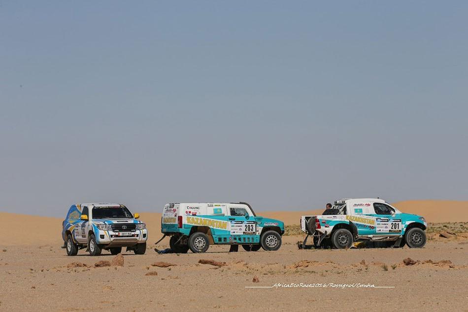 Всего же на старт вышло четыре казахстанских экипажа в автомобильном зачёте и Евгения Нестерова на мотоцикле. Юрий Сазонов с российским штурманом Алексеем Кузьмичом (хотя Алексея вполне можно считать нашим, ещё в 2012 году он ассистировал Артуру Ардавичусу, когда Astana заняла третье место на южноамериканском «Дакаре») заняли по итогам гонки 8-е место. До третьего этапа ребята на Hummer H3 Evo лидировали в гонке, однако на 4-м этапе пробили три колеса и финишировали на диске, в результате чего потеряли много времени.