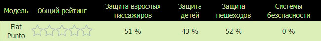 Ну а как же получилось, что Fiat Punto стал машиной, впервые в истории получившей ноль, когда 12 лет назад эта же модель удостоилась пяти звёзд? Причина — новые ужесточённые правила EuroNCAP. В целом результаты «Пунто» не очень плохие: 51 % — за безопасность седоков спереди, 43 % — за детей и 52 % — за пешеходов.