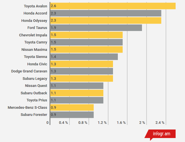 При этом в отдельный рейтинг специалисты вынесли легковые машины и минивэны (то есть исключили внедорожники и пикапы). И если в абсолюте наилучшим показателем были 5.7 %, то в числе легковушек победителем оказался седан Toyota Avalon (2.6 %). Серебро досталось Honda Accord (2.3 %), а бронзу забрал вэн Honda Odyssey (2.3 %).