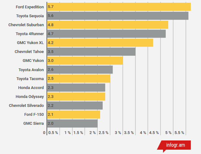 В этом массиве аналитики отобрали авто с пробегом более 320 тысяч километров и посчитали их долю от общего количества экземпляров каждой модели. В абсолюте наиболее выносливой машиной оказался Ford Expedition. Из числа этих внедорожников 5.7 % пробежали свыше 320 тысяч. На второй строчке разместился Toyota Sequoia — 5.6 %, а на третьем Chevrolet Suburban — 4.8 %.