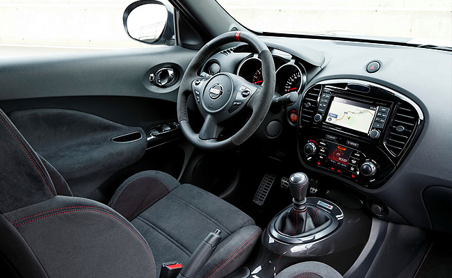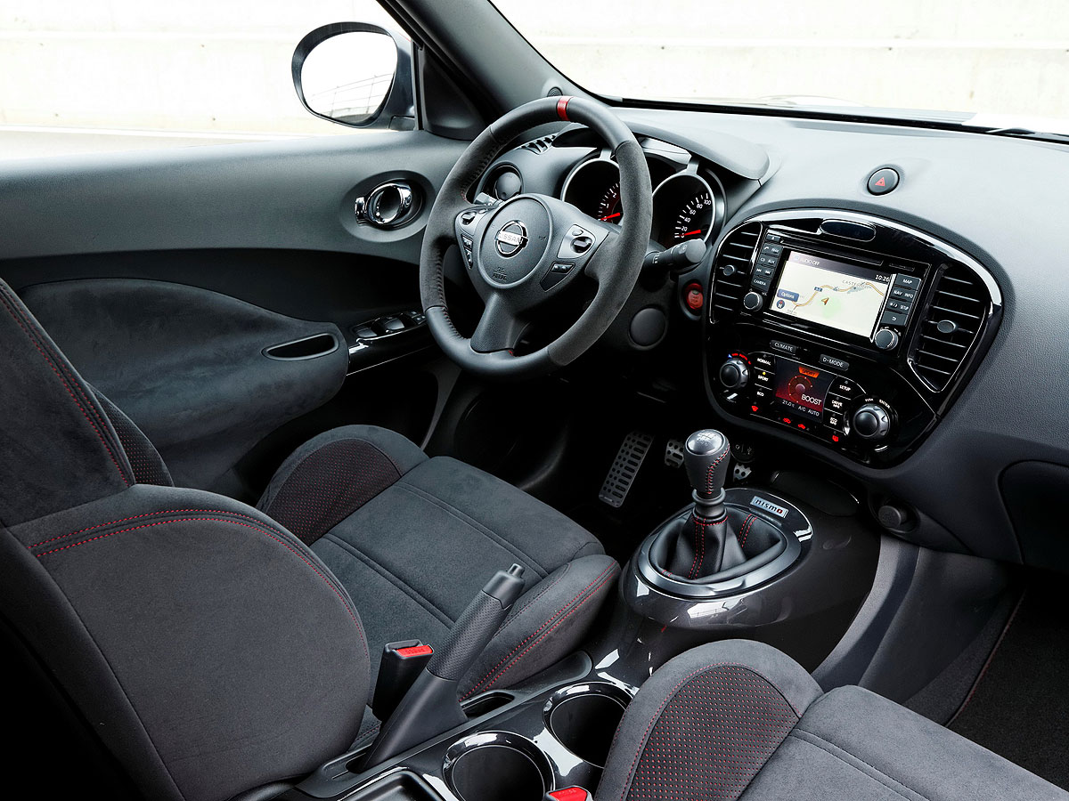 В салоне спортивные сиденья из алькантары, замшевый руль, накладки на педали и прочие мелочи вроде красного циферблата тахометра, таблички с надписью Nismo и т. д.