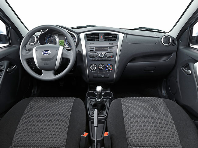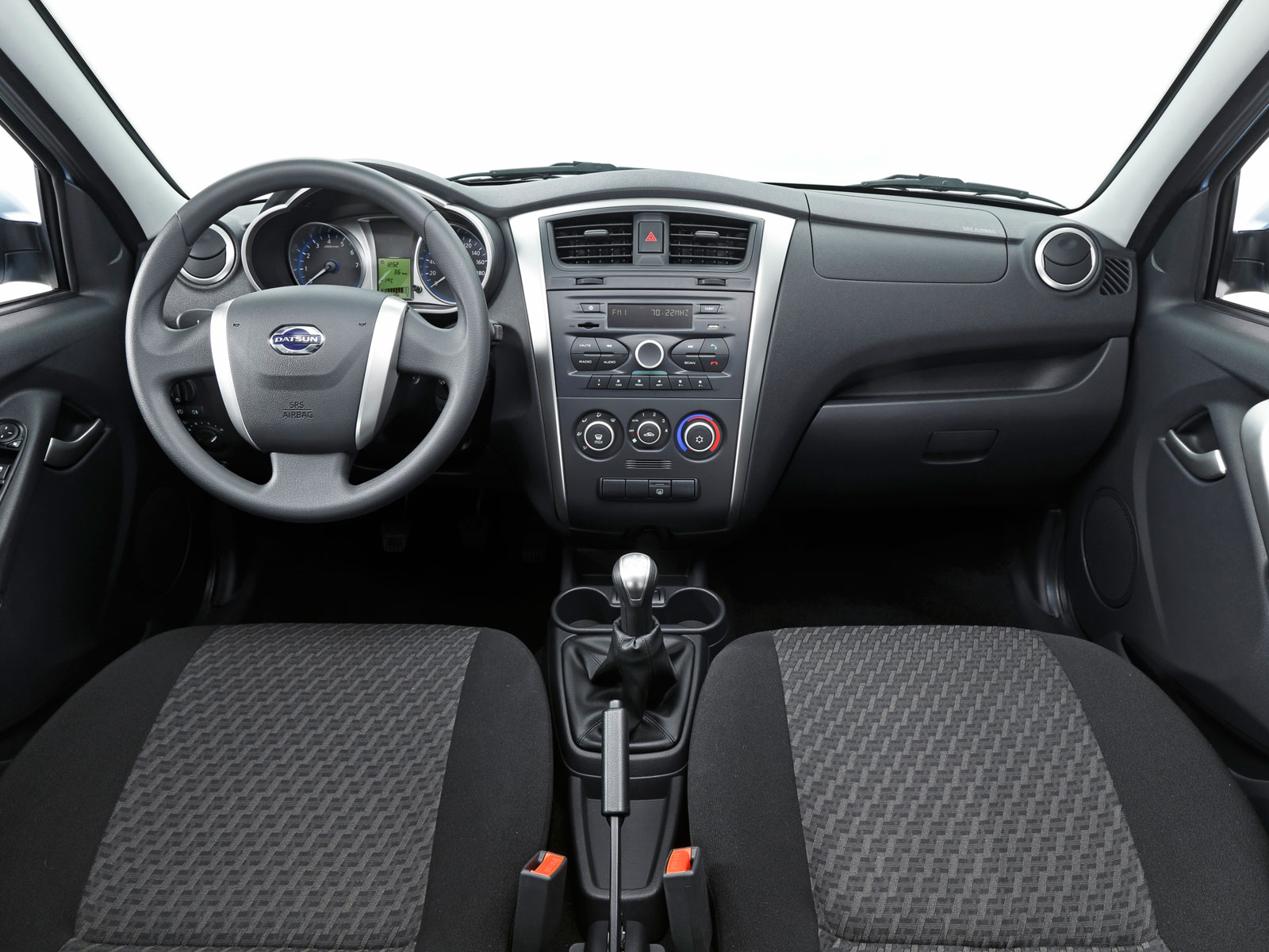 В салоне сходств с «ладами» больше: от моделей Kalina и Granta заимствованы приборы, блок управления кондиционера, дверные панели, подстаканники и т. д. Из нового здесь передние сиденья, аудиосистема с гнездом USB и разъёмом под SD-карту, а в базовую комплектацию входит водительская подушка безопасности и ABS. Интересно: японцы уверяют, что Datsun внутри будет иметь собственный запах, отличный от ароматов «Лады».