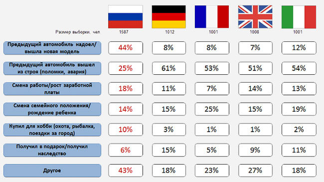Европейцы оказались более рациональны. В то время как около 10 % россиян могут купить автомобиль для хобби, в Старом Свете это могут позволить не более 3 % опрошенных. Даже среди темпераментных итальянцев лишь 12 % готовы продать надоевший автомобиль ради приобретения чего-то нового.
