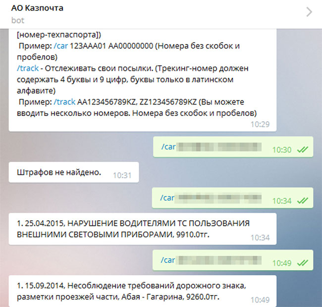 Для того чтобы узнать информацию о выписанных штрафах, необходимо загрузить приложение Telegram, найти в строке «Поиск» пользователя @KazPostBot и ввести команду «/car». Пример: /car 121RAA04 ZE12345678 или /car Z111AAA ZE12345678. Номера при этом должны быть указаны именно в таком виде.