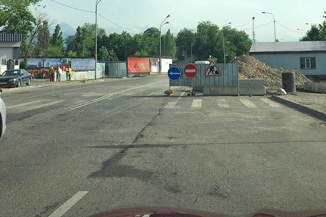 Несмотря на знаки, водители ещё здесь проезжают. На самом же отрезке улицы, где должна появиться развязка, уже ведутся строительные работы — вырыт котлован. Дорога сужается. Руководство Управления транспорта и автомобильных дорог г. Алматы сообщило, что рабочие начали готовить фундамент для опоры будущего моста и с 27 мая отрезок ул. Фурманова от Суюнбая до Райымбека будет полностью закрыт.