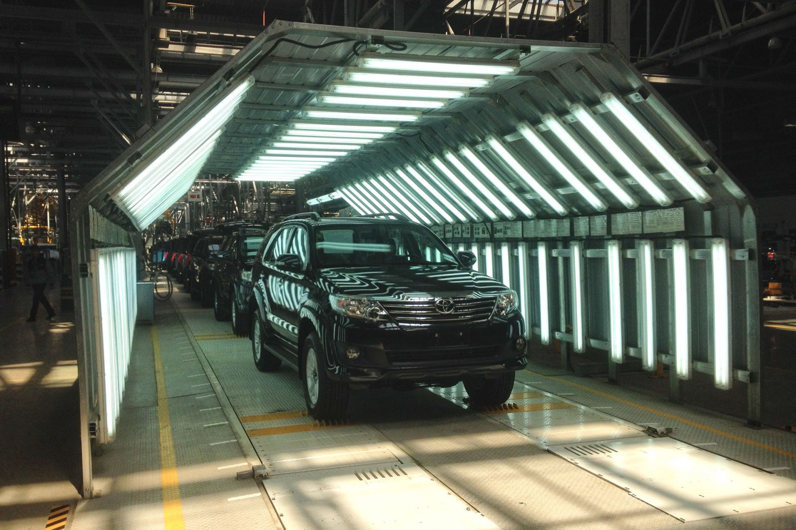 Fortuner на самом деле производят здесь уже два месяца, но в тестовом режиме на одном конвейере с «Номадом». После проверки всех степеней готовности к запуску производства, Toyota подтвердила полное соответствие требуемым нормам и сегодня запускает производство товарных автомобилей. В трёх цехах (сварки, окраски и мелкоузловой сборки) планируют выпускать до 3 000 машин ежегодно. Кстати, по имеющейся у нас информации, производство кузовов осуществляется работниками завода, а не роботами. Пока не тот масштаб.